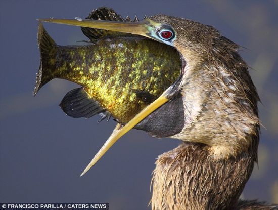 37歲野生動物攝影師哈維爾-帕里拉-佩雷斯在佛羅里達州一個國家公園拍到這些照片。當時,這隻鳥正用魚叉一樣的利嘴叉著獵物。這只美洲蛇鳥吞嚥這條魚時嘴巴越張越大,好像就要窒息的樣子,令佩雷斯和妻子非常震驚,他們目瞪口呆。